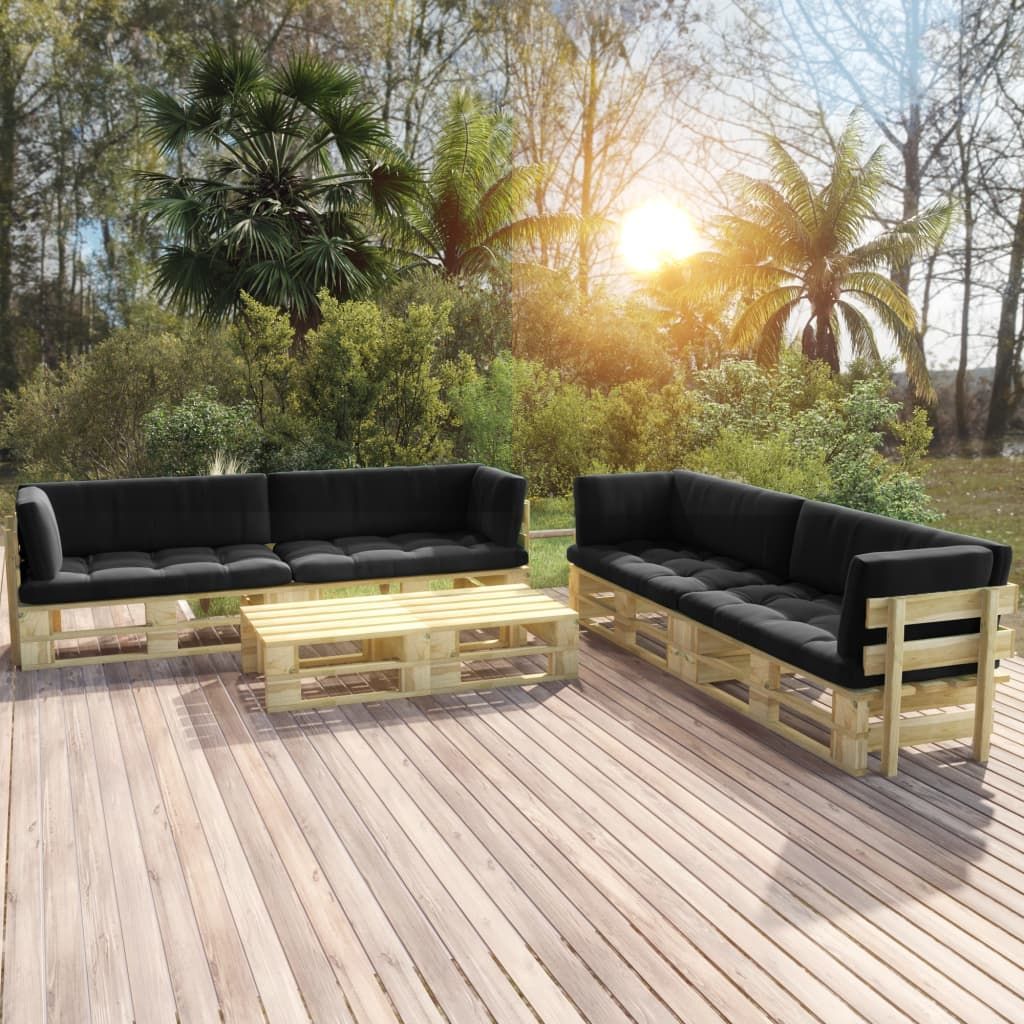 Opis produktu: Ten ogrodowy zestaw mebli wypoczynkowych z drewnianych palet stanowi znakomity wybór, aby się zrelaksować i nacieszyć dobrą pogodą albo zdrzemnąć lub porozmawiać z rodziną lub przyjaciółmi. Za sprawą ponadczasowej konstrukcji z palet ten ogrodowy komplet wniesie odrobinę rustykalnego uroku na Twoje patio, do ogrodu lub do salonu. Wykonany z impregnowanego drewna sosnowego zestaw mebli ogrodowych jest trwały i odporny na czynniki atmosferyczne. Charakteryzuje się solidną konstrukcją i łatwością utrzymania. Wraz z dołączonymi poduszkami zapewni najwyższy komfort Tobie i Twoim gościom. Uwaga: aby przedłużyć żywotność mebli ogrodowych, zalecamy zabezpieczenie ich wodoodpornym pokrowcem.
