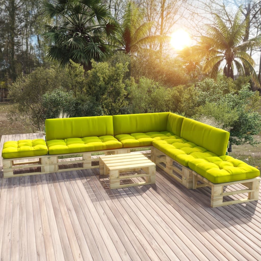 Ten ogrodowy zestaw mebli wypoczynkowych z drewnianych palet stanowi znakomity wybór, aby się zrelaksować i nacieszyć dobrą pogodą albo zdrzemnąć lub porozmawiać z rodziną lub przyjaciółmi. Za sprawą ponadczasowej konstrukcji z palet ten ogrodowy komplet wniesie odrobinę rustykalnego uroku na Twoje patio, do ogrodu lub do salonu. Wykonany z impregnowanego drewna sosnowego zestaw mebli ogrodowych jest trwały i odporny na czynniki atmosferyczne. Charakteryzuje się solidną konstrukcją i łatwością utrzymania. Wraz z dołączonymi poduszkami zapewni najwyższy komfort Tobie i Twoim gościom. Uwaga: aby przedłużyć żywotność mebli ogrodowych, zalecamy zabezpieczenie ich wodoodpornym pokrowcem.