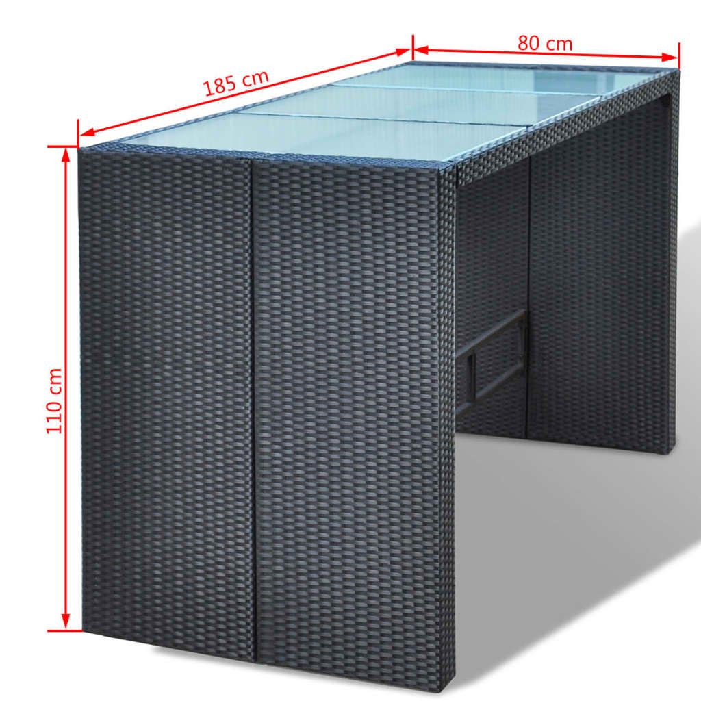 Elegancki zestaw mebli polirattanowych będzie przyciągał uwagę w ogrodzie, na tarasie lub patio. Zestaw wykonany z odpornego na czynniki pogodowe i wodę rattanu PE, z blatem z 3 matowych płyt ze szkła hartowanego jest łatwy do czyszczenia, mocny i odpowiedni do codziennego użytku. Kryta proszkowo, stalowa rama sprawia, że stół i krzesła są stabilne i trwałe. Dzięki lekkiej konstrukcji meble są łatwe do przenoszenia. Grube, zdejmowane poduszki są wyjątkowo komfortowe. Poszewki z poduszek z suwakami można zdjąć i wyprać. W skład przesyłki wchodzi stół z blatem ze szkła, 6 krzeseł barowych i 6 zdejmowanych poduszek na siedziska. Uwaga: zalecamy przykrycie zestawu na czas deszczu, śniegu i mrozu.