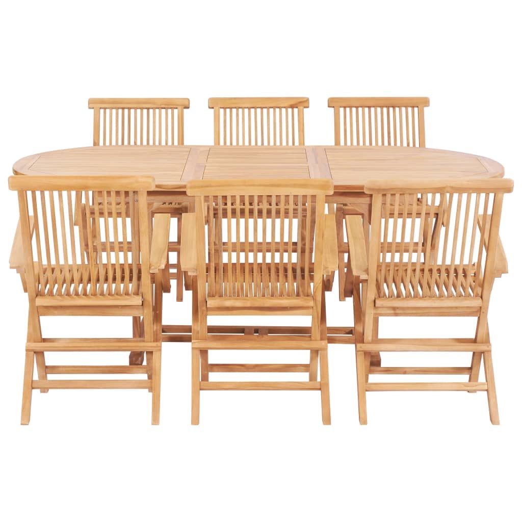 Opis produktu: Zestaw mebli ogrodowych z litego drewna będzie znakomitym wyborem do spożywania posiłków w Twojej kuchni, ogrodzie lub na patio. Produkt ten wykonano z niezwykle trwałego, twardego drewna tekowego, które było sezonowane, suszone komorowo, a następnie drobno oszlifowane, by nadać mu bardzo gładką powierzchnię. Drewno to słynie z wyjątkowej wytrzymałości i odporności na czynniki atmosferyczne, dzięki czemu jest dużo bardziej odpowiednie do produkcji mebli ogrodowych niż jakikolwiek inny rodzaj drewna. Tek to idealny wybór, jeśli chcesz zakupić trwałe meble ogrodowe. Stół i krzesła mają piękne wykończenie, nadające drewnu ciepły kolor. Dzięki specjalnej konstrukcji stół do jadalni można przedłużyć maksymalnie o 200 cm, gdy potrzebna jest dodatkowa przestrzeń. Poza tym w blacie znajduje się otwór, w którym można zainstalować parasol. Przesyłka obejmuje 1 rozkładany owalny stół i 6 rozkładanych krzeseł.