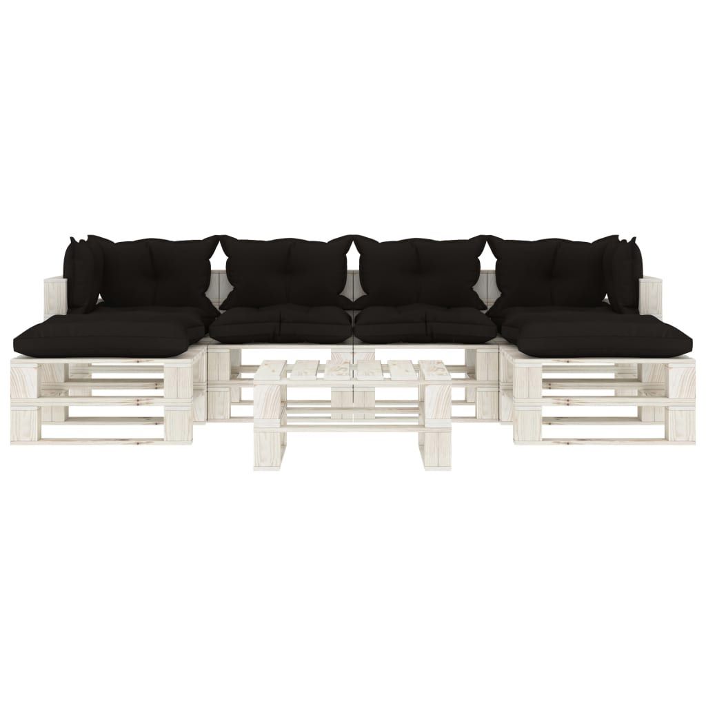 7-cz. zestaw mebli do ogrodu, palety z drewna, czarne poduszki