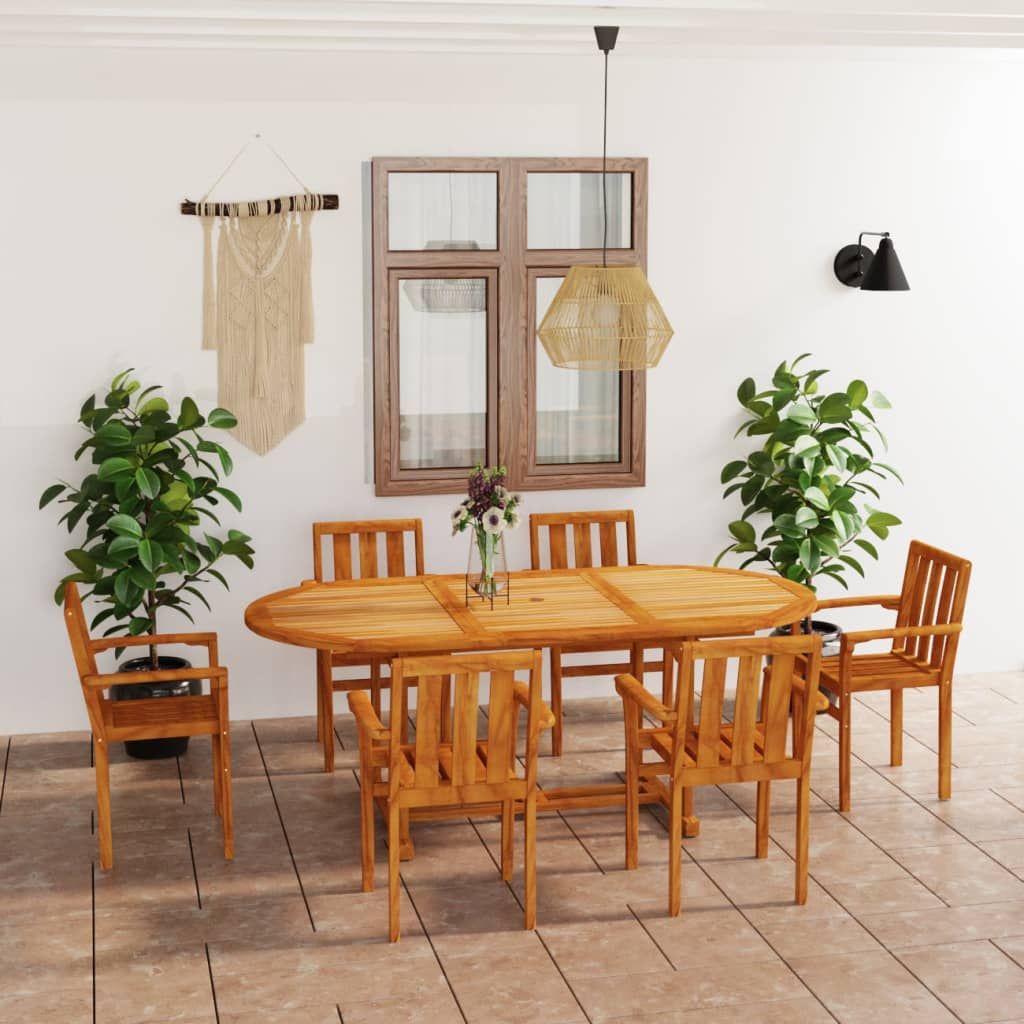 Opis produktu: Ten drewniany zestaw mebli ogrodowych sprawdzi się idealnie do spożywania posiłków na świeżym powietrzu lub relaksu w ogrodzie czy na patio. Jest również świetny do użytku w pomieszczeniach. Produkt wykonano z niezwykle trwałego, twardego drewna tekowego, które było sezonowane, suszone komorowo, a następnie drobno oszlifowane, by nadać mu bardzo gładką powierzchnię. Drewno tekowe słynie z wyjątkowej wytrzymałości i odporności na czynniki atmosferyczne, dzięki czemu jest znacznie bardziej odpowiednie do produkcji mebli ogrodowych niż jakikolwiek inny rodzaj drewna. Tek to idealny wybór, jeśli chcesz zakupić trwałe meble ogrodowe. Ponadto meble odporne na wilgoć i owady. Mają piękne wykończenie, nadające drewnu ciepły kolor. Dzięki specjalnej konstrukcji stół można przedłużyć do długości maksymalnie 200 cm, gdy wymagana jest dodatkowa przestrzeń. Posiada również otwór na parasol, aby zapewnić ochronę przed słońcem. Poza tym krzesła można złożyć w stos, gdy nie są używane, aby zaoszczędzić miejsce do przechowywania. Dodatkowo zestaw ten można łatwo wyczyścić wilgotną ściereczką