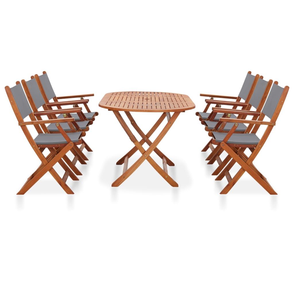 Opis produktu: Ten stylowy i nowoczesny zestaw jadalniany będzie naprawdę doskonałym wyborem, by zjeść posiłek na świeżym powietrzu: w ogrodzie lub na patio. Składany zestaw mebli jadalnianych wykonano z litego drewna eukaliptusowego, które zapewnia mu trwałość i odporność na niekorzystne warunki pogodowe. Wykończona olejem powierzchnia jest łatwa w czyszczeniu, wystarczy wilgotna ściereczka. Składana konstrukcja ułatwia przechowywanie i transport zestawu.