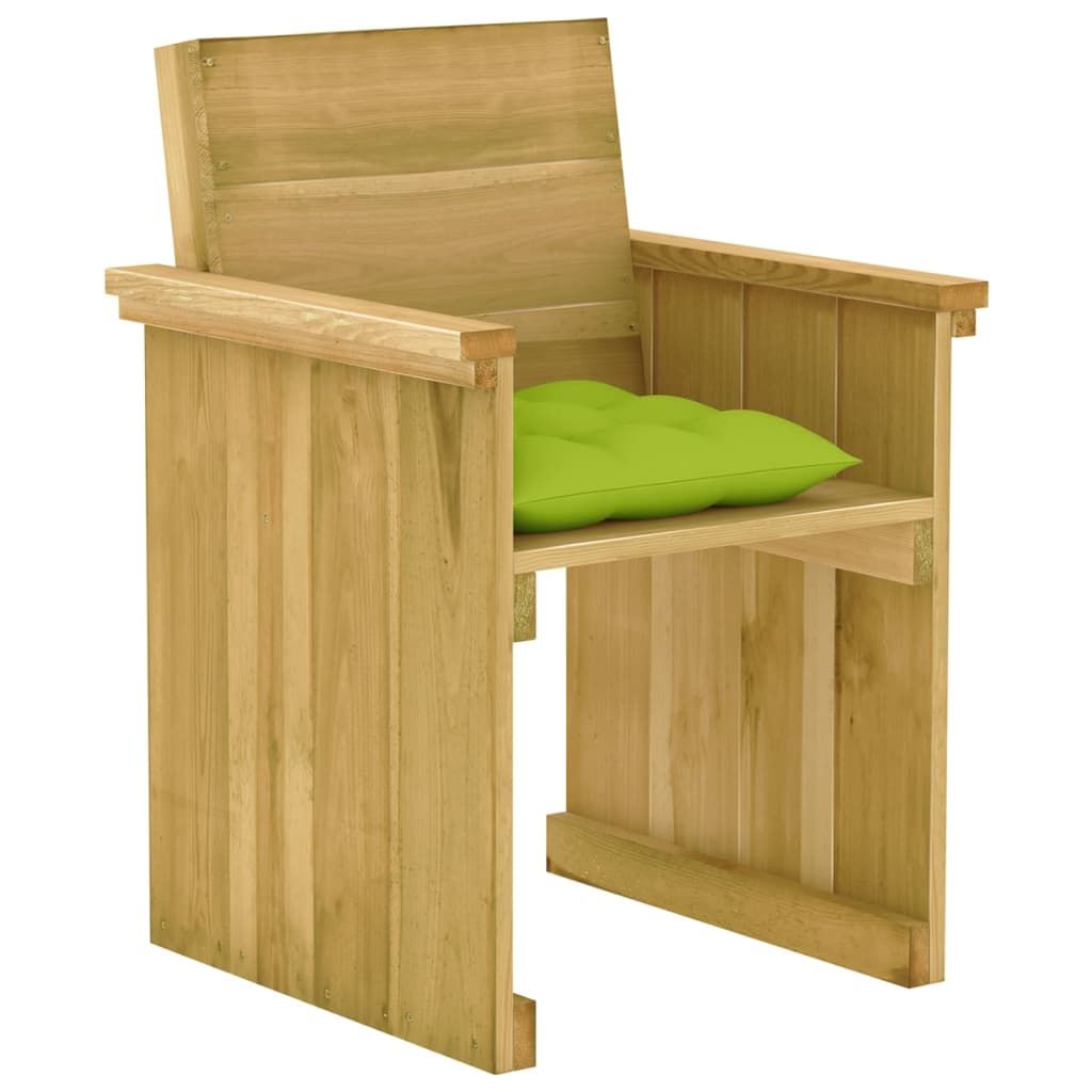 Opis produktu: Stwórz fascynującą i spójną estetykę w swojej przestrzeni na świeżym powietrzu dzięki naszemu zestawowi jadalnianemu do ogrodu! Stół i krzesła prezentują elegancki i ponadczasowy design i zostały wykonane z impregnowanego drewna sosnowego, które jest trwałe, odporne na czynniki pogodowe i przyjazne dla środowiska. Możesz umieścić ten zestaw w ogrodzie lub na patio, aby móc w przyjemnym otoczeniu czytać książki i wypić kawę. Poduszki wykonano ze 100% poliestru, dzięki czemu są mocne i trwałe. Sprawdzą się również zarówno wewnątrz, jak i na zewnątrz pomieszczeń, oferując miękkie i wytrzymałe siedzisko. Dobrej jakości przeszycia na krawędziach zapewniają lata użytkowania. Ponadto poduszki mają sznurki, które umożliwiają ich łatwe przymocowanie do siedzisk. Uwaga: aby przedłużyć żywotność mebli ogrodowych, zalecamy zabezpieczenie ich wodoodpornym pokrowcem.