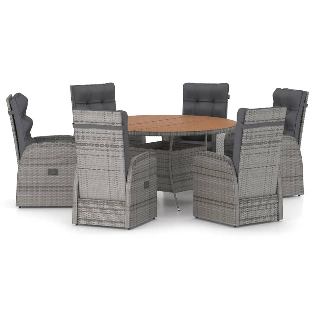 Ten zestaw mebli ogrodowych o eleganckim i współczesnym designie będzie przyciągającym wzrok dodatkiem do Twojej przestrzeni na świeżym powietrzu. Zestaw mebli ogrodowych zawiera solidne, stalowe ramy malowane proszkowo, które są bardzo stabilne i trwałe. Dzięki rattanowi PE komplet ten jest łatwy w czyszczeniu, wytrzymały i nadaje się do codziennego użytku na zewnątrz. Blat wykonano z litego drewna akacjowego - tropikalnego twardego drewna, które jest odporne na warunki atmosferyczne i trwałe. Krzesła z odchylanymi oparciami oferują najwyższy komfort siedzenia i świetne podparcie. Oparcie można łatwo regulować, zgodnie z własnym uznaniem, za pomocą przycisku z boku. Dodatkowo grube i miękkie poduszki na siedzisku i oparciu są również bardzo wygodne. Ich łatwe w utrzymaniu poszewki z poliestru można bez problemu zdejmować i prać. Uwaga: zalecamy przykrycie zestawu na czas deszczu, śniegu lub mrozu, aby przedłużyć jego żywotność.