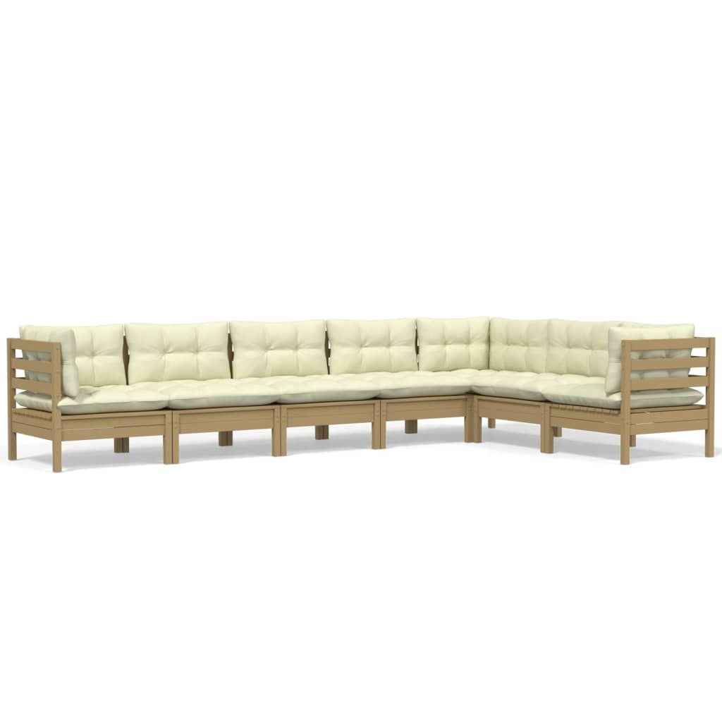 Opis produktu: Ten ogrodowy zestaw wypoczynkowy jest znakomitym wyborem na relaks i korzystanie z pogody, a także drzemkę czy rozmowę z rodziną lub przyjaciółmi. Zestaw wypoczynkowy do ogrodu wykonano z litego drewna sosnowego, dzięki czemu jest solidny i stabilny. Poduszki oferują większy komfort. Możesz zestawiać ten komplet z innymi modułami i tworzyć własne aranżacje mebli wypoczynkowych w ogrodzie! Uwaga: aby przedłużyć żywotność mebli ogrodowych, zalecamy zabezpieczenie ich wodoodpornym pokrowcem.