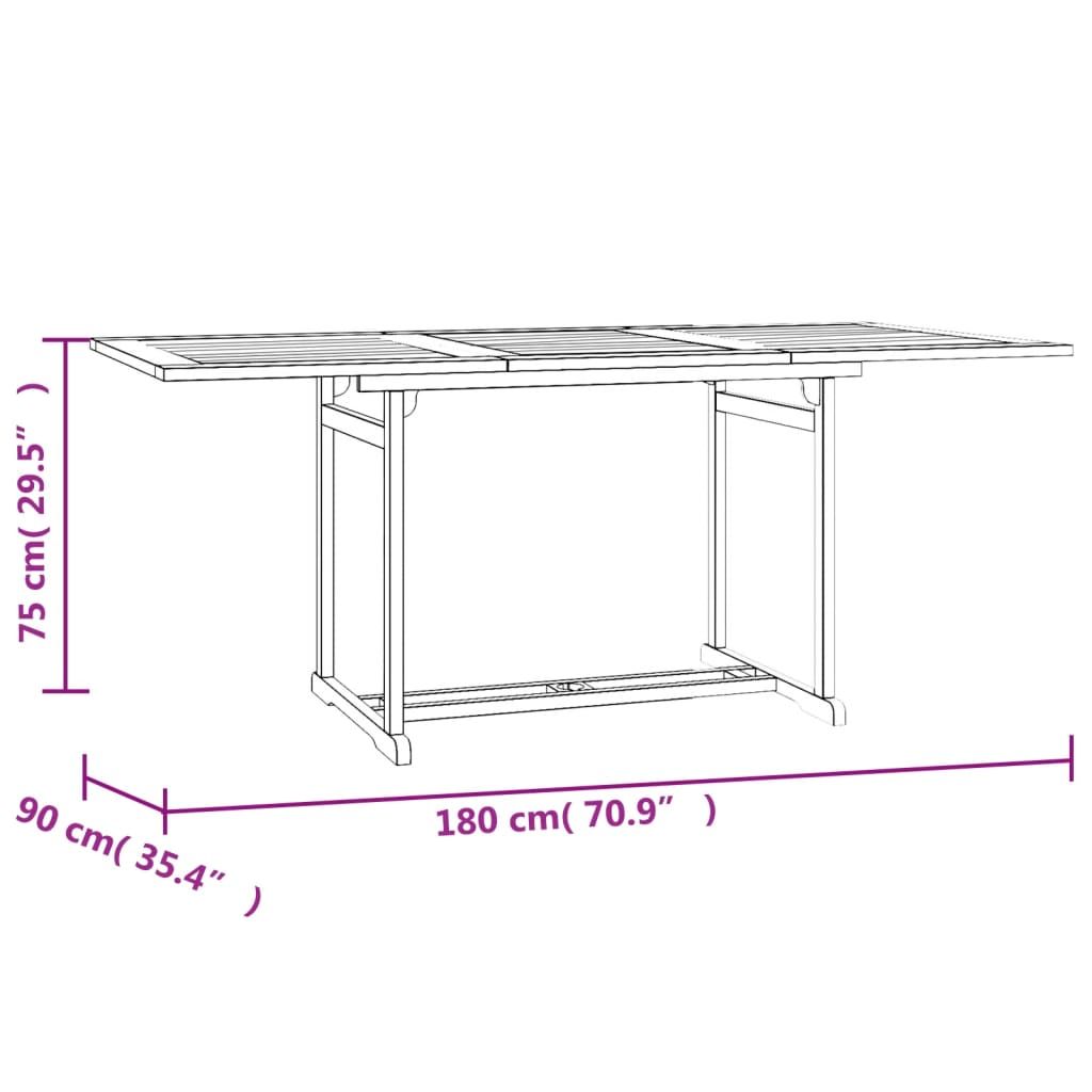 Podnieś komfort swojej przestrzeni na zewnątrz za sprawą tego klasycznego, drewnianego zestawu mebli! Trwały materiał: lite drewno tekowe to piękny, naturalny materiał. Był on sezonowany i suszony komorowo, a potem został precyzyjnie oszlifowany, aby nadać mu wyjątkowo gładką powierzchnię. Drewno tekowe słynie z niezwykłej wytrzymałości i odporności na czynniki atmosferyczne.Stabilna rama: drewniane ramy kompletu zapewniają jego solidność i stabilność.Praktyczny stół: dzięki szlifowanej powierzchni stół jest odporny na czynniki pogodowe i łatwy w czyszczeniu. W blacie znajduje się otwór na parasol, co umożliwia łatwe przymocowanie parasola i stworzenie odrobiny cienia.Wygodne krzesła: oparcia krzeseł ogrodowych można ustawić w 6 pozycjach, dzięki czemu zawsze znajdziesz najwygodniejszą dla siebie konfigurację. Krzesła można również z łatwością złożyć, gdy nie są używane, co ułatwia przechowywanie i transport. Warto wiedzieć:Aby maksymalnie ułatwić montaż, każdy produkt jest dostarczany z instrukcją obsługi. Uwaga:Aby utrzymać meble ogrodowe w dobrej kondycji, zalecamy zabezpieczenie ich wodoodpornym pokrowcem.