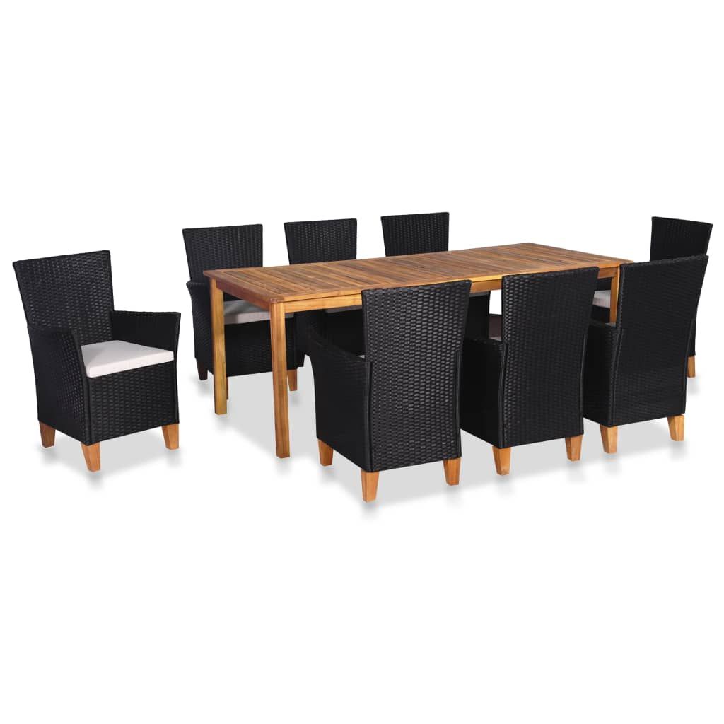 Opis produktu: Rozkoszuj się posiłkiem na świeżym powietrzu z rodziną lub przyjaciółmi dzięki naszemu zestawowi mebli! Stół ogrodowy wykonano z litego drewna akacjowego wykończonego olejem, co czyni go mocnym i wytrzymałym. Ma on ponadczasową formę i roztacza rustykalny czar. Dzięki zastosowaniu wodoodpornego rattanu PE krzesła są wytrzymałe i łatwe w utrzymaniu. Stalowe ramy i nóżki z litego drewna akacjowego nadają im solidność i stabilność. Krzesła są dostarczane wraz z wygodnymi poduszkami. Ich łatwe w utrzymaniu poliestrowe powłoczki można zdjąć i wyprać, gdy zajdzie taka potrzeba. Montaż mebli jest łatwy. Przesyłka obejmuje 1 stół i 8 krzeseł (wraz z 8 poduszkami na siedziska). Uwaga: zalecamy przykrycie zestawu na czas deszczu, śniegu lub mrozu.