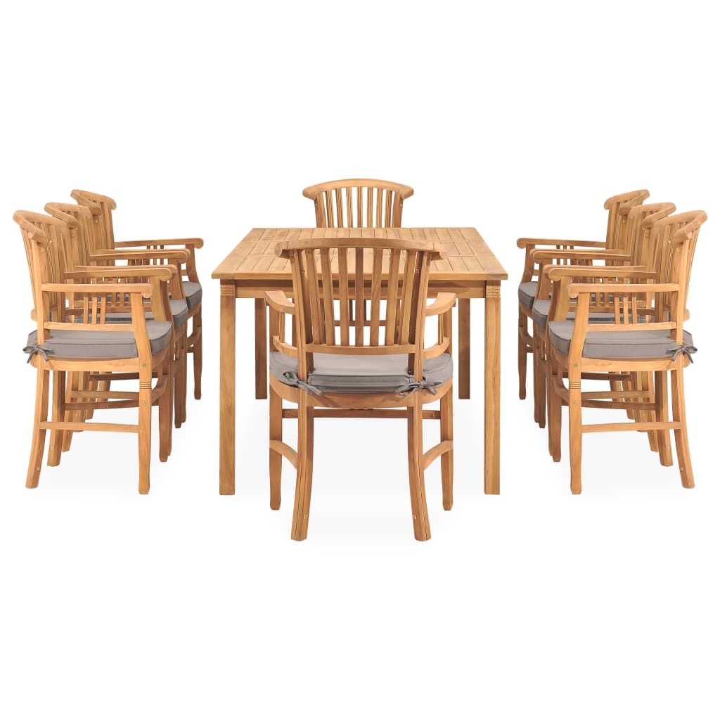 Opis produktu: Zestaw mebli ogrodowych z litego drewna tekowego wniesie odrobinę wyrafinowania oraz elegancji do Twojej przestrzeni na zewnątrz. Meble wykonano z niezwykle wytrzymałego drewna tekowego, które było sezonowane, suszone komorowo i drobno szlifowane, aby nadać mu bardzo gładki wygląd. Tek słynie ze swojej wyjątkowej wytrzymałości i odporności na warunki atmosferyczne, dzięki czemu jest o wiele bardziej odpowiedni do produkcji mebli ogrodowych niż jakiekolwiek inny rodzaj drewna. Drewno tekowe to idealny wybór, jeśli chcesz kupić trwałe meble do ogrodu. Grubo wypełnione poduszki zapewniają większy komfort podczas spożywania posiłków i relaksu. Ich zapinane na suwaki poszewki można łatwo zdjąć i wyprać.