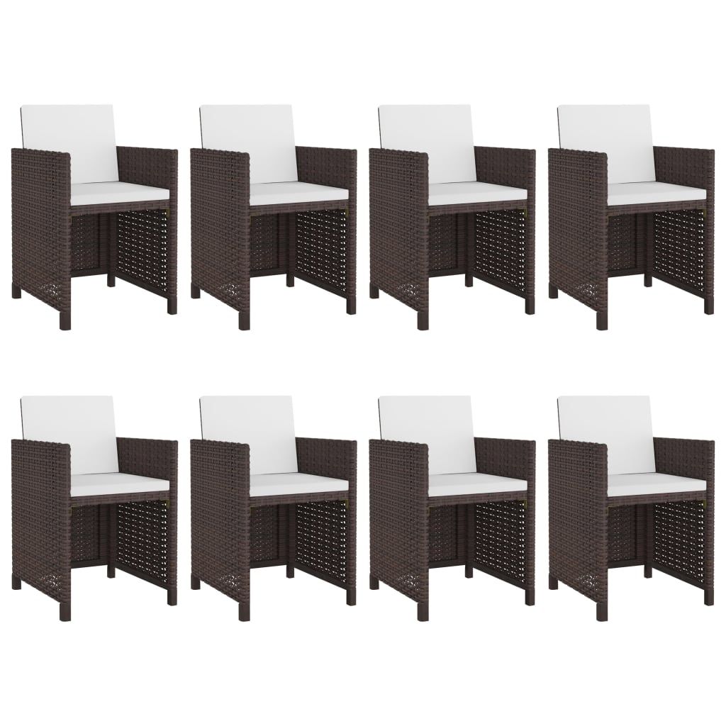 Nasze stylowe meble rattanowe staną się centralnym punktem Twojego ogrodu lub tarasu! Ten zestaw o eleganckiej formie będzie doskonałym wyborem do spożywania posiłków na świeżym powietrzu lub odpoczynku w ogrodzie. Kryta proszkowo stalowa rama nadaje meblom stabilność, a dzięki lekkiej konstrukcji poszczególne elementy można łatwo przestawić. Wykonane z odpornego na działanie wody i warunków pogodowych rattanu PE meble są łatwe w czyszczeniu. Blat stołu ze szkła jest również łatwy do czyszczenia przy użyciu wilgotnej ściereczki. Grube, miękkie, wypełnione pianką siedziska i oparcia są bardzo wygodne i wykonane z wodoodpornego poliestru. Zdejmowane poszewki wyposażono w zamki błyskawiczne. Co więcej, można opuścić oparcie i przechowywać cztery krzesła pod stołem, oszczędzając cenną przestrzeń, gdy zestaw nie jest używany. Przesyłka zawiera: 1 stół, 8 krzeseł i 16 poduszek. Zalecamy przykrycie zestawu na czas deszczu, śniegu i mrozu.