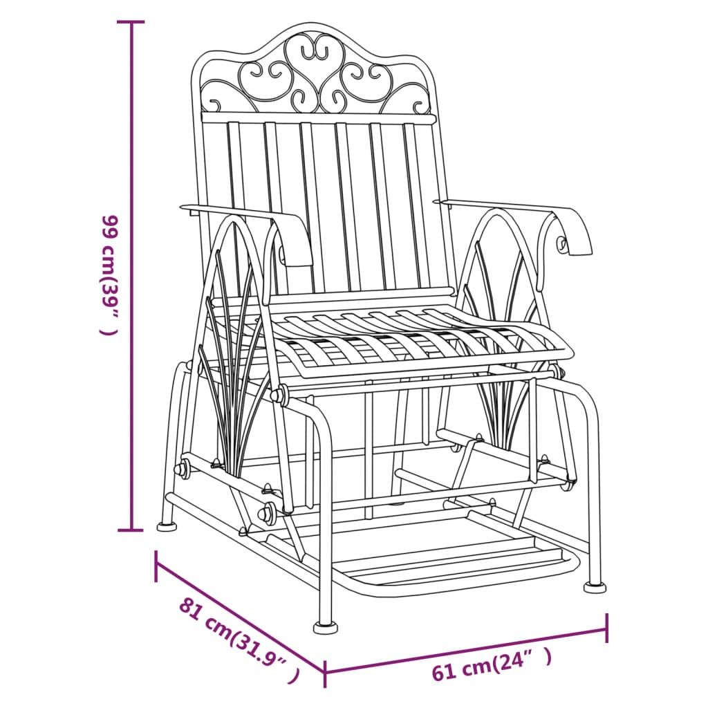 Zrelaksuj się kołysaniem i ciesz się wolnym czasem na tym metalowym, bujanym krześle! Funkcja kołysania: ławeczka pozwala bujać się w przód i w tył z wykorzystaniem mechanizmu kołysania. Możesz więc cieszyć się kojącym, delikatnym ruchem.Najwyższej jakości materiał: wykonana ze stali ławka jest odporna na warunki atmosferyczne i bardzo trwała, dzięki czemu idealnie nadaje się do codziennego użytku na zewnątrz.Wygodne miejsce do siedzenia: szerokie i wysokie oparcie oraz siedzisko w połączeniu z podłokietnikami zapewniają wygodę podczas siedzenia.Stylowy wygląd: ozdobne wzory i elegancki design tego krzesła na taras z pewnością upiększą Twoją strefę wypoczynku. Uwaga:Aby przedłużyć żywotność mebli ogrodowych, zalecamy zabezpieczenie ich wodoodpornym pokrowcem.
