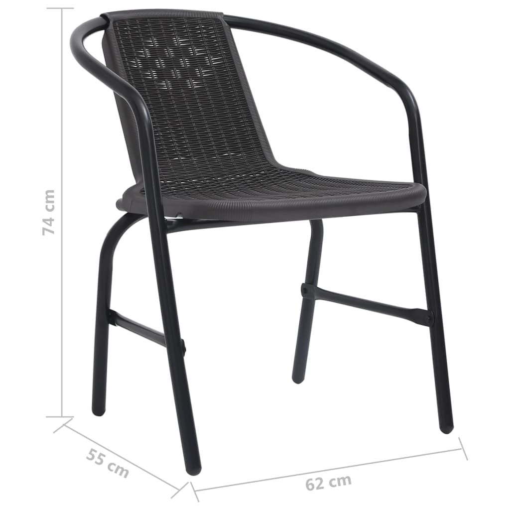 Ten zestaw krzeseł ogrodowych o eleganckim i współczesnym designie stylizowanym na rattan będzie przyciągającym wzrok dodatkiem do Twojej przestrzeni na świeżym powietrzu. Dzięki stalowej ramie krzesła te są stabilne i mocne. Siedziska z rattanu syntetycznego zwiększają komfort siedzenia. Dodatkowo można je składać w stos, aby zaoszczędzić miejsce, gdy nie są używane. Uwaga: aby przedłużyć żywotność mebli ogrodowych, zalecamy zabezpieczenie ich wodoodpornym pokrowcem.