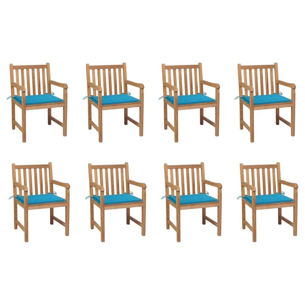 Krzesła ogrodowe, 8 szt., niebieskie poduszki, drewno tekowe