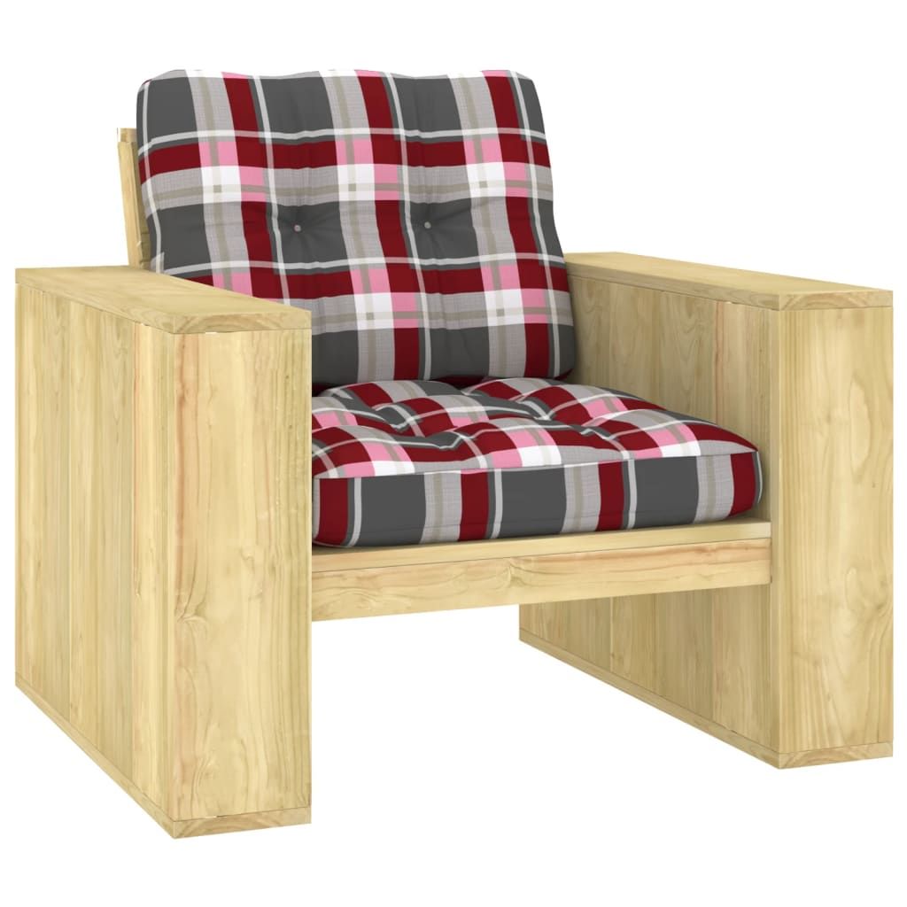 Krzesło ogrodowe z poduszkami w czerwoną kratę, drewno sosnowe