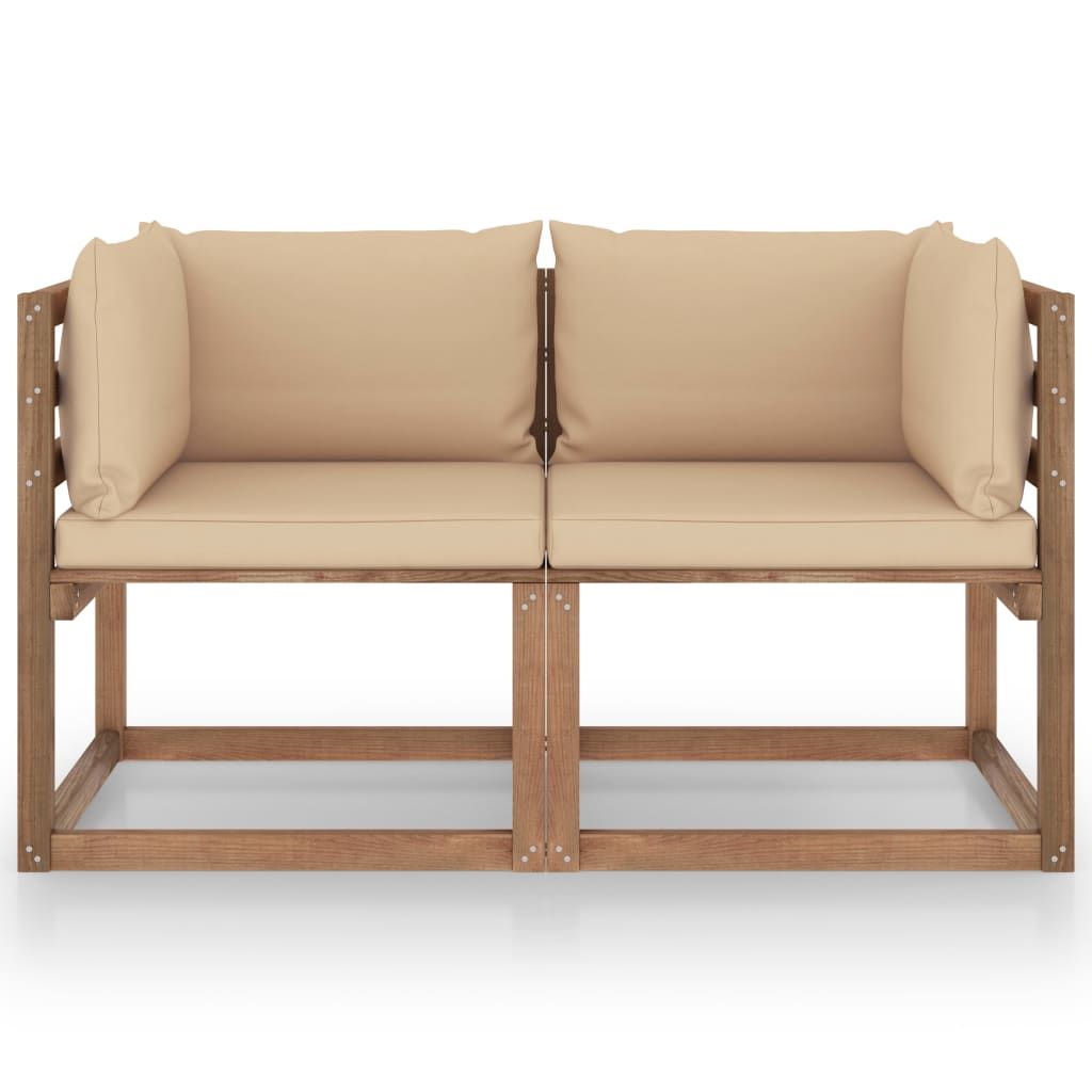 Ogrodowa sofa 2-os. z palet, z beżowymi poduszkami, sosna