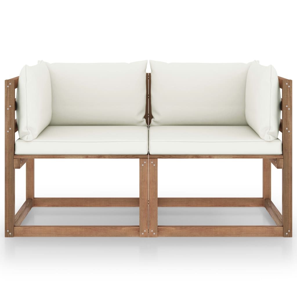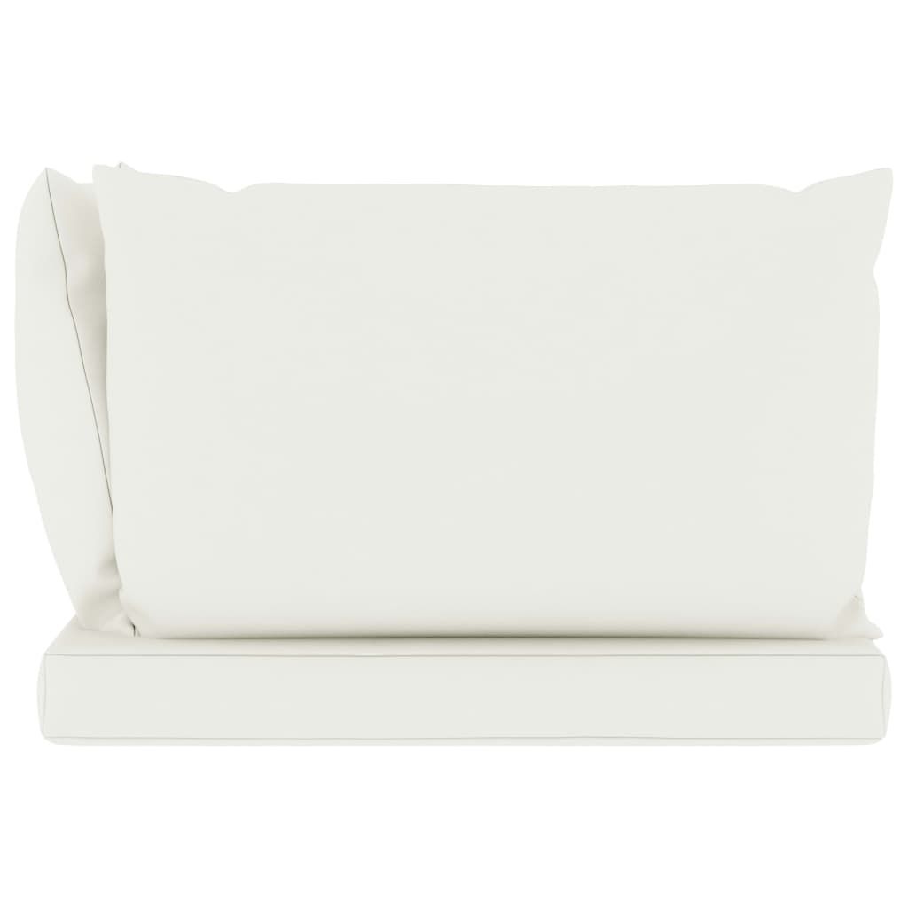 Ogrodowa sofa 2-os. z palet, z kremowymi poduszkami, sosna