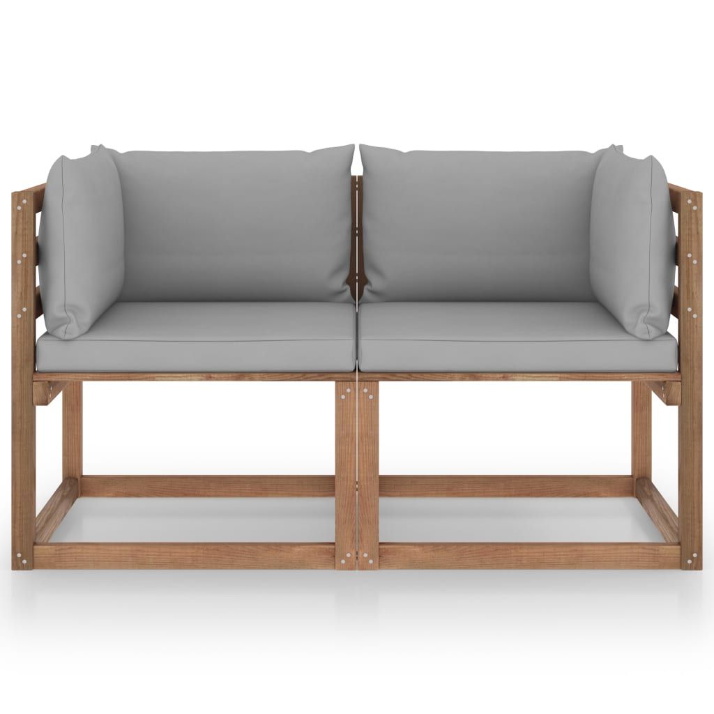 Ogrodowa sofa 2-os. z palet, z szarymi poduszkami, sosna