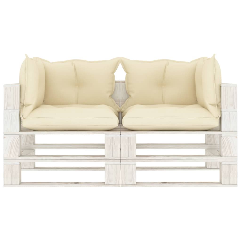 Ogrodowa sofa 2-osobowa z palet, z kremowymi poduszkami, drewno