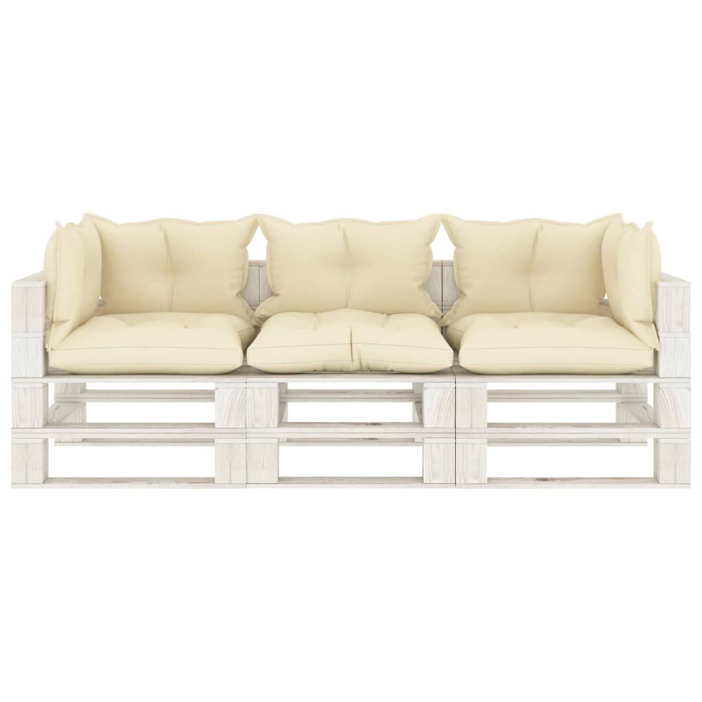 Ogrodowa sofa 3-osobowa z palet, z kremowymi poduszkami, drewno