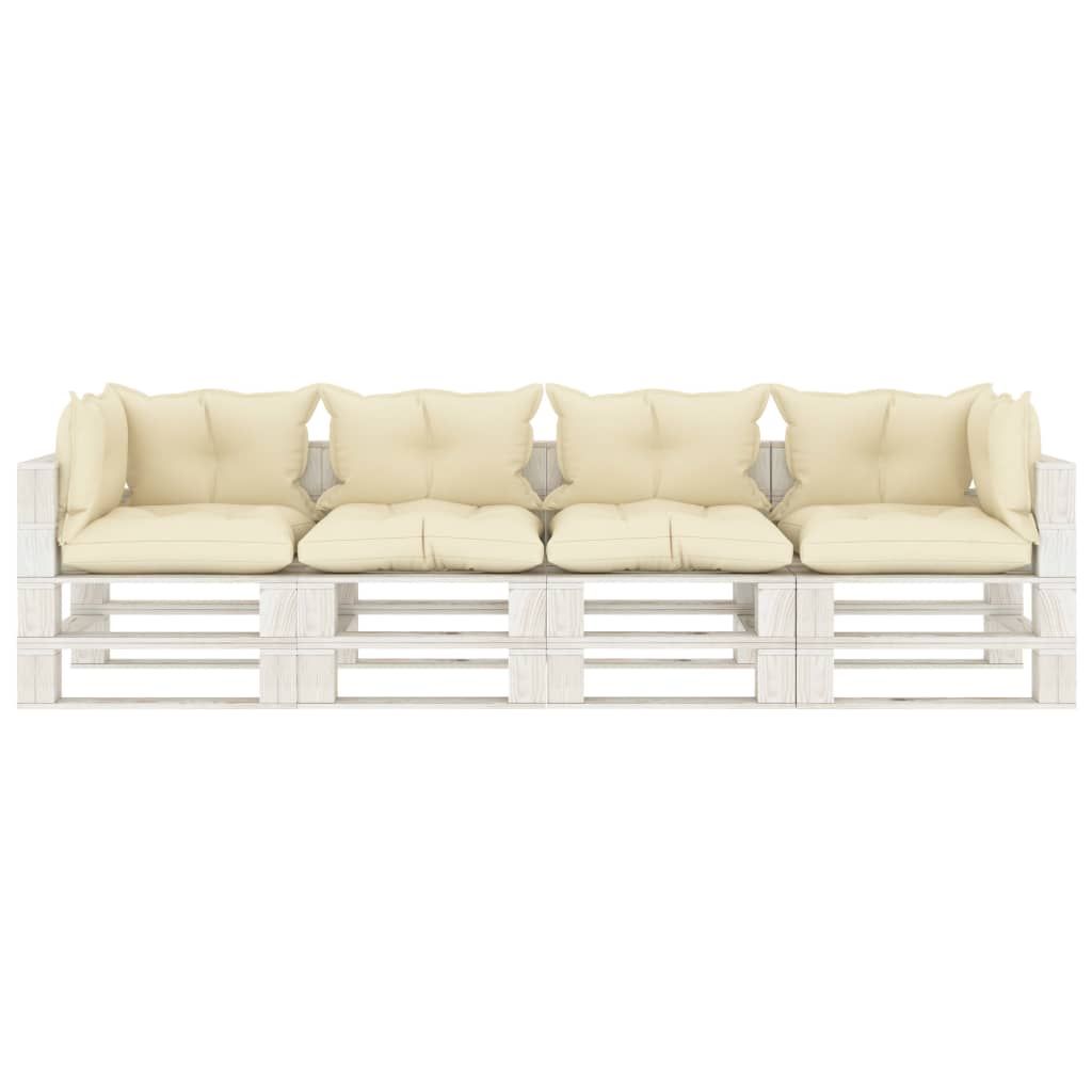 Ogrodowa sofa 4-osobowa z palet, z kremowymi poduszkami, drewno