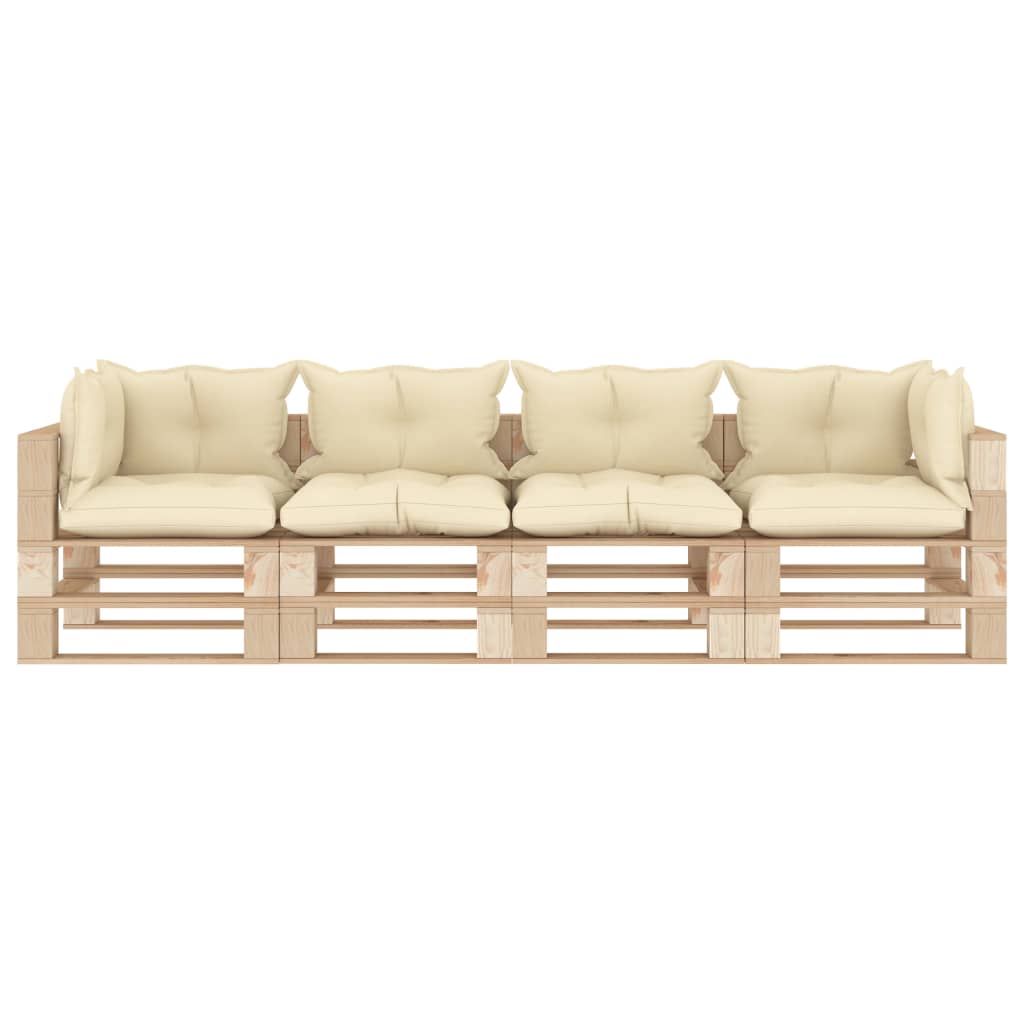 Ogrodowa sofa 4-osobowa z palet, z kremowymi poduszkami