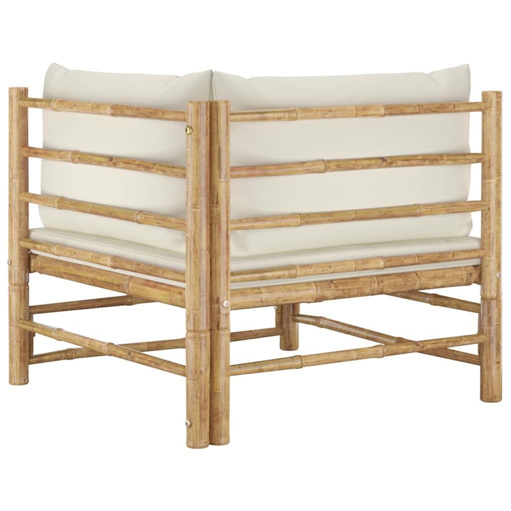 Ogrodowa sofa narożna, śmietankowe poduszki, bambus