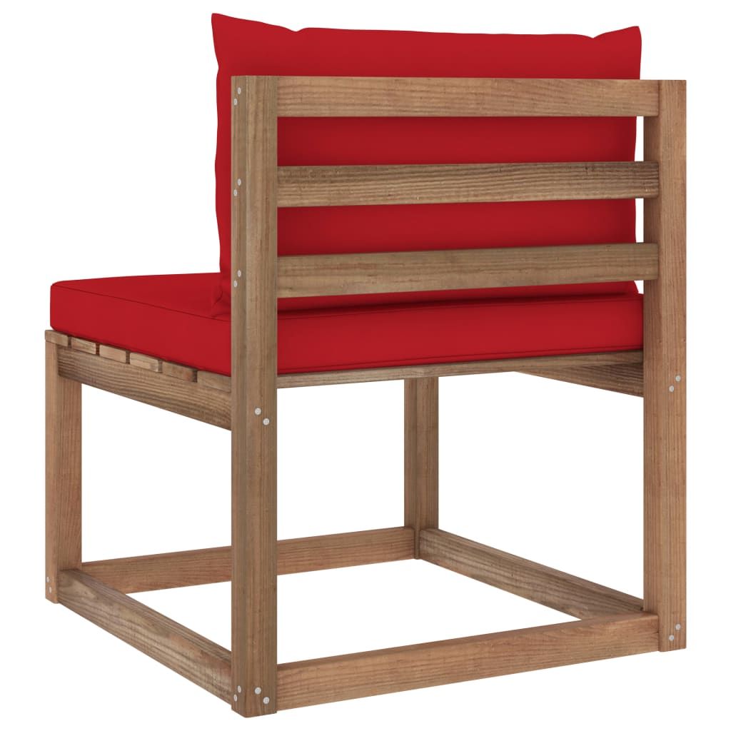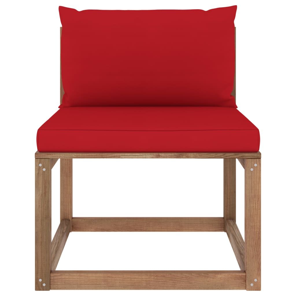 Ogrodowa sofa środkowa z palet, z czerwonymi poduszkami