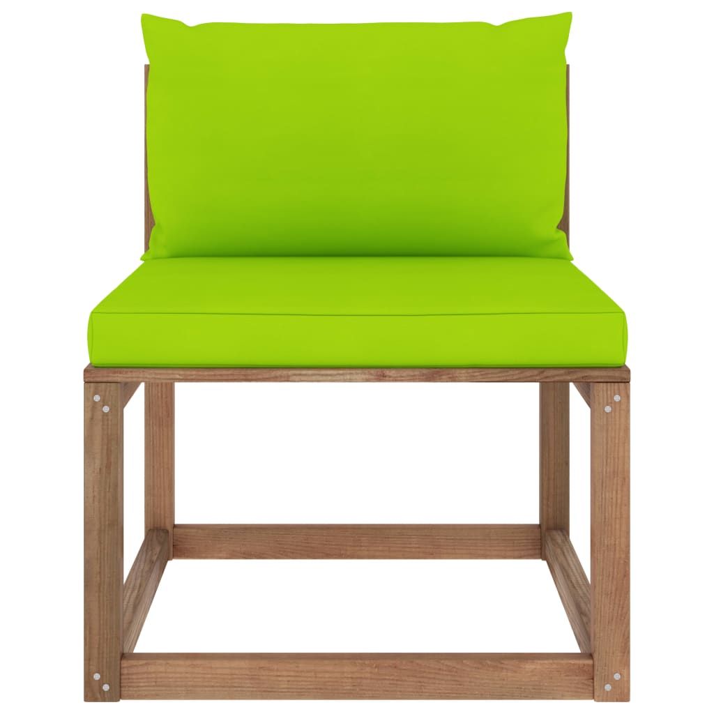 Ogrodowa sofa środkowa z palet, z jasnozielonymi poduszkami