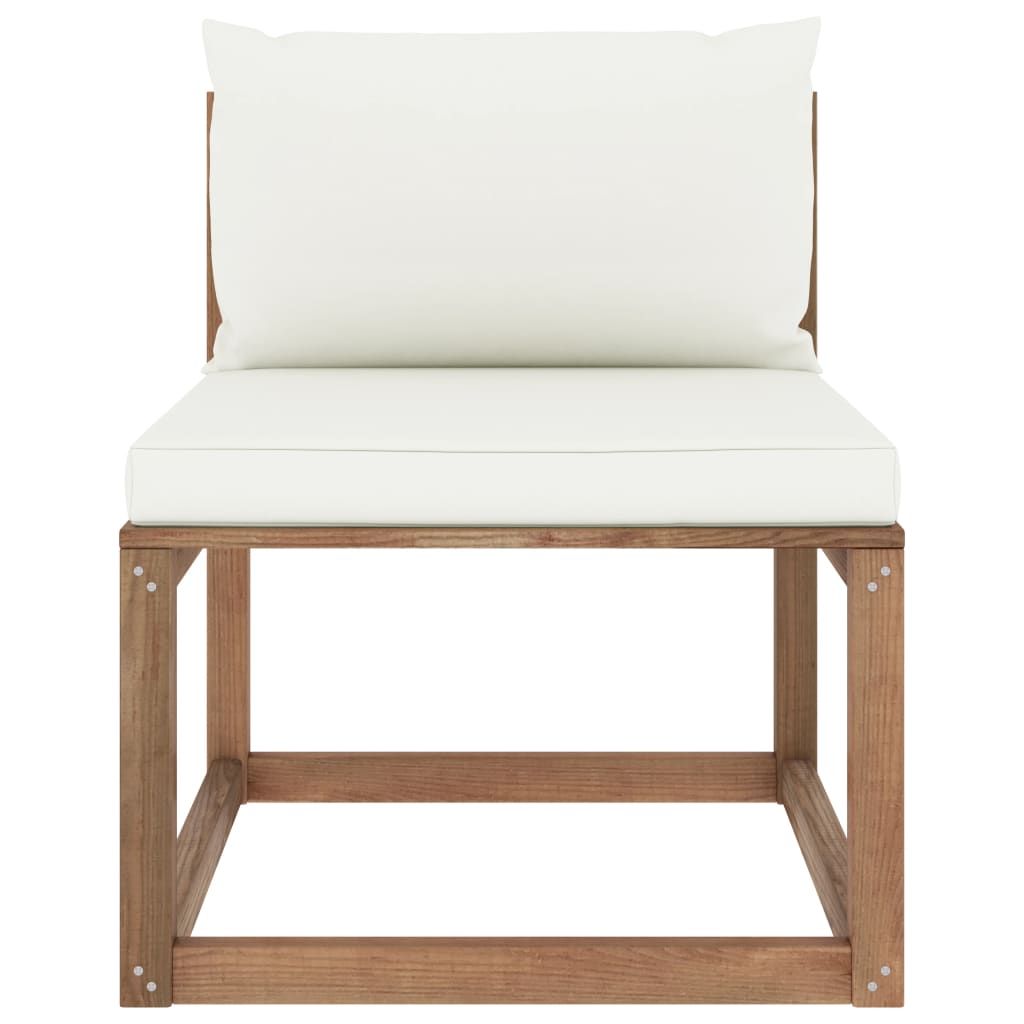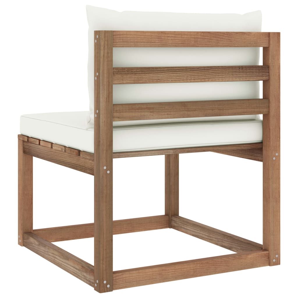 Ogrodowa sofa środkowa z palet, z kremowymi poduszkami