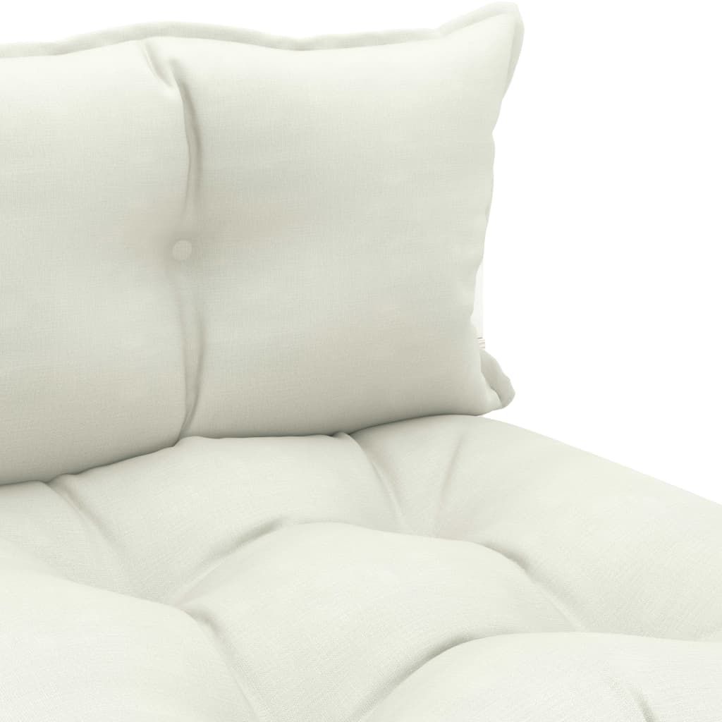 Ogrodowe siedzisko z palet, z beżowymi poduszkami, drewniane