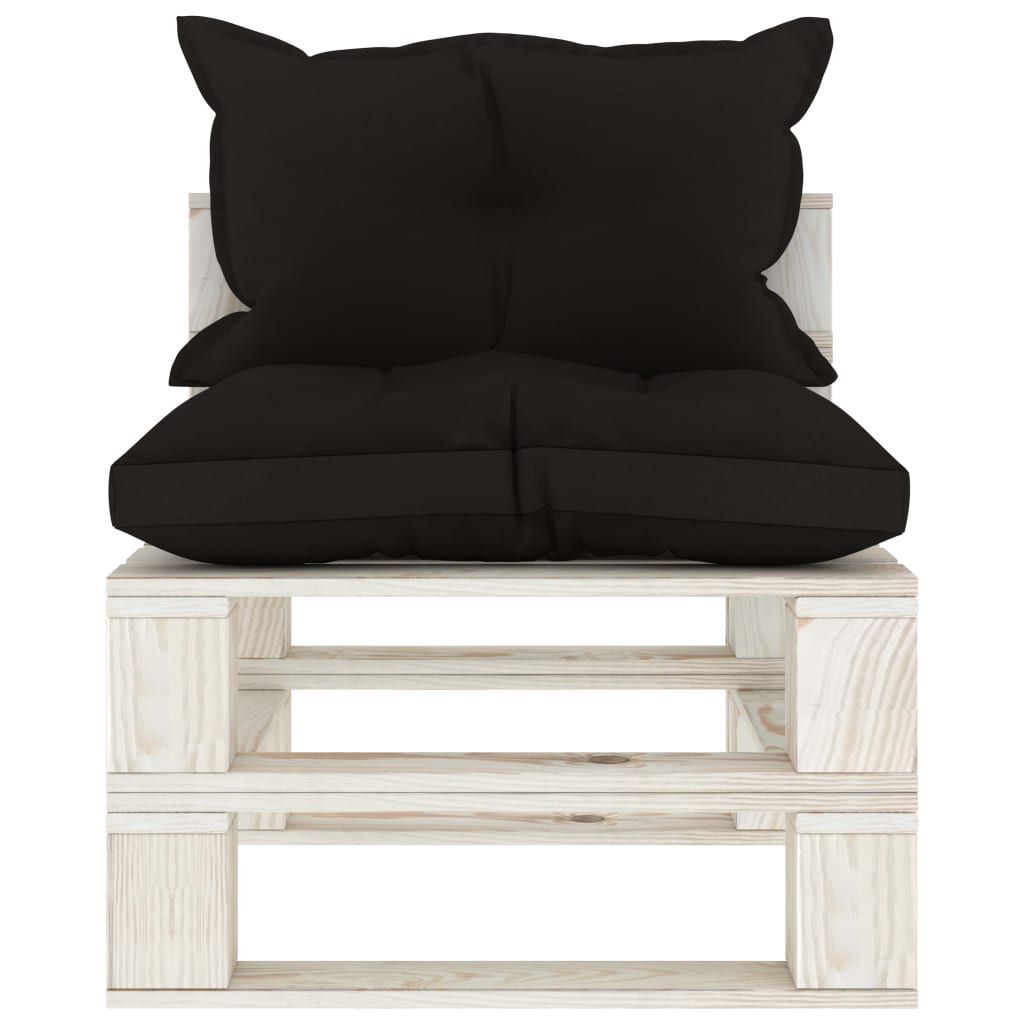 Ogrodowe siedzisko z palet, z czarnymi poduszkami, drewniane