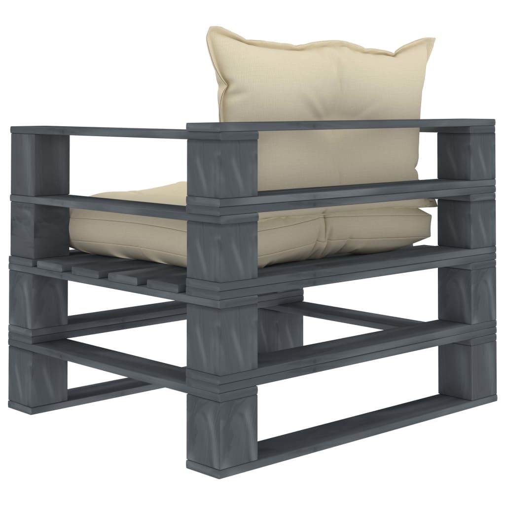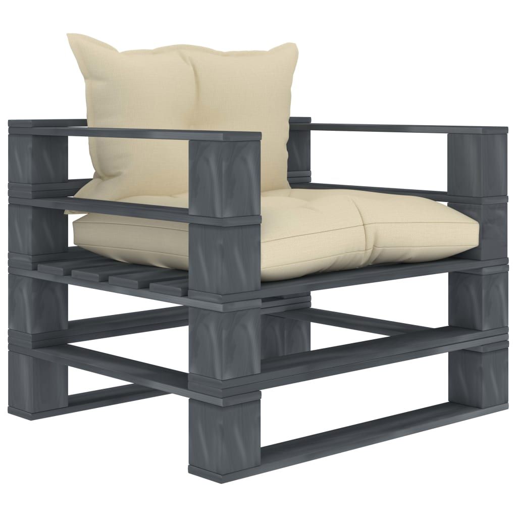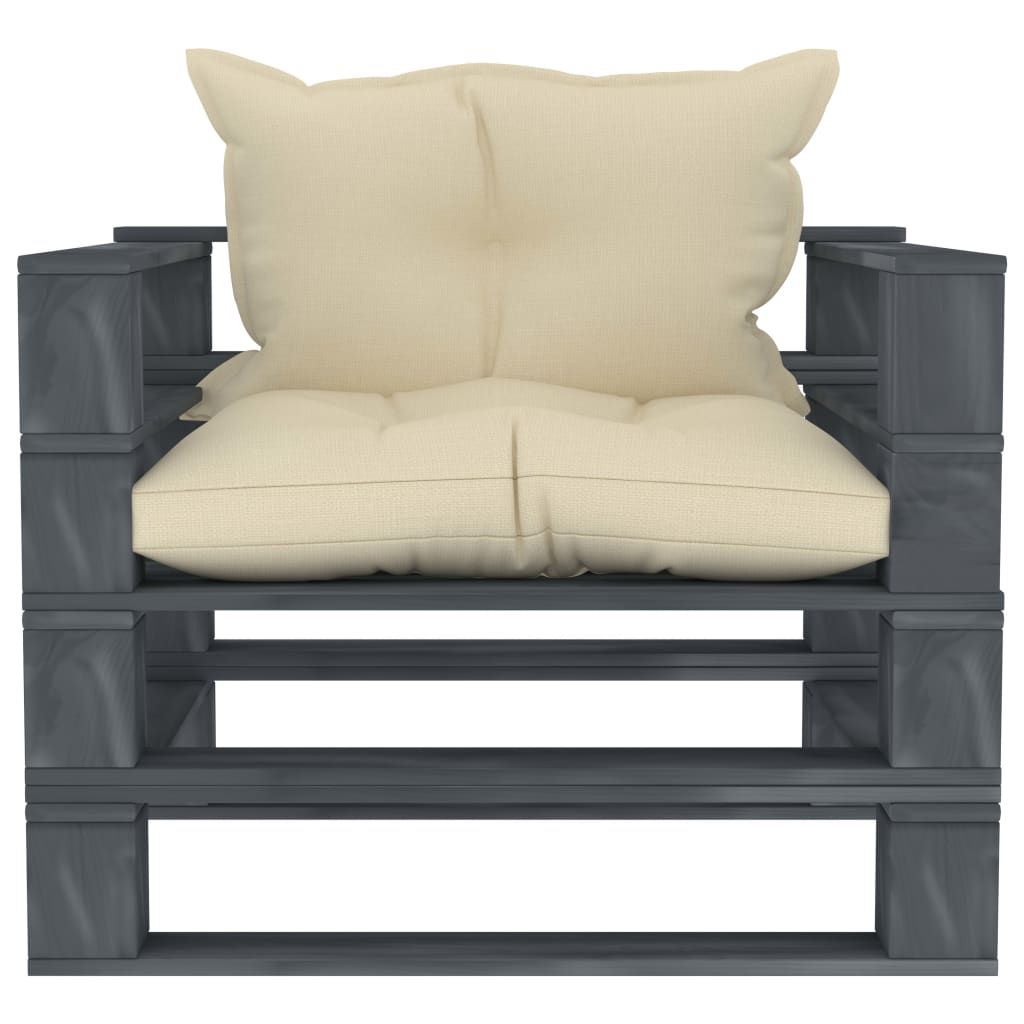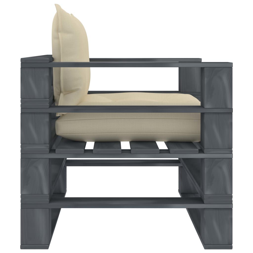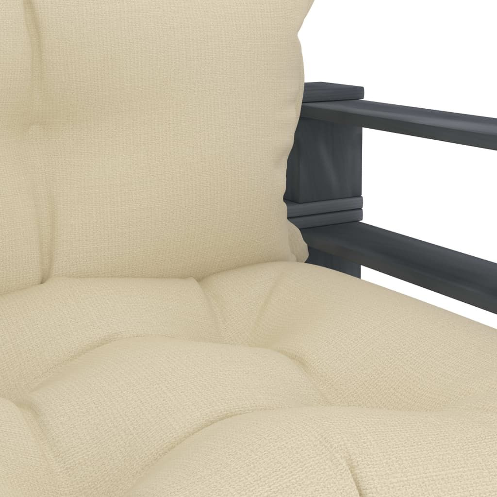 Ogrodowe siedzisko z palet, z kremowymi poduszkami, drewniane