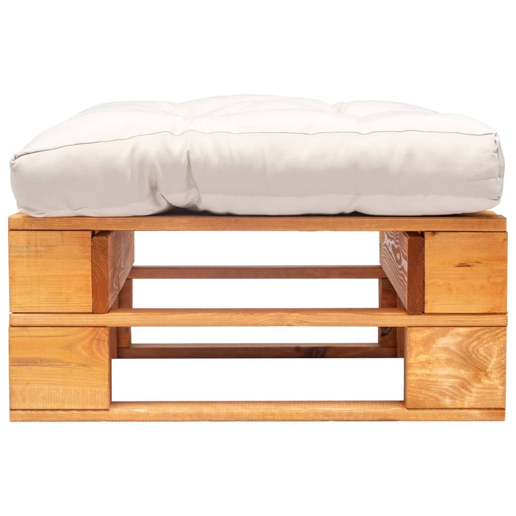 Nasze ogrodowe siedzisko z palet będzie idealnym wyborem, aby odpocząć i cieszyć się pogodą. Dzięki ponadczasowemu wyglądowi drewniany podnóżek doda odrobinę rustykalnego uroku Twojemu patio, ogrodowi lub salonowi. Możesz również zdjąć poduszkę i zmienić siedzisko w stolik kawowy! Wykonany z impregnowanego drewna sosnowego podnóżek ogrodowy jest trwały, odporny na czynniki pogodowe i przyjazny dla środowiska. Ten mebel na patio ma solidną konstrukcję i wymaga niewielkiej konserwacji. Wyposażone w miękką, grubo wyściełaną poduszkę nasze siedzisko ogrodowe zapewni komfort na najwyższym poziomie. Montaż siedziska jest łatwy. Prosimy mieć na uwadze, że drewno to materiał naturalny i może wykazywać niewielkie niedoskonałości.