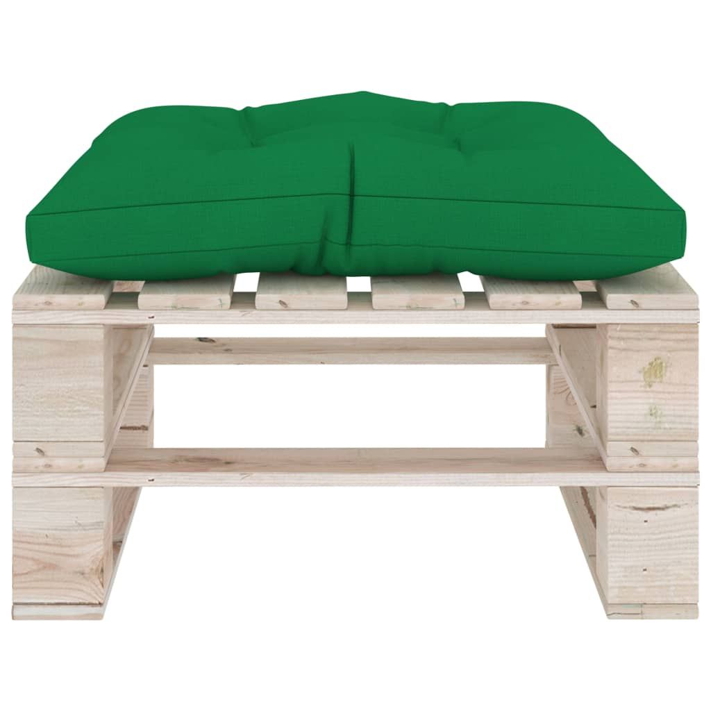 Ogrodowy stołek z palet z zieloną poduszką, drewno sosnowe