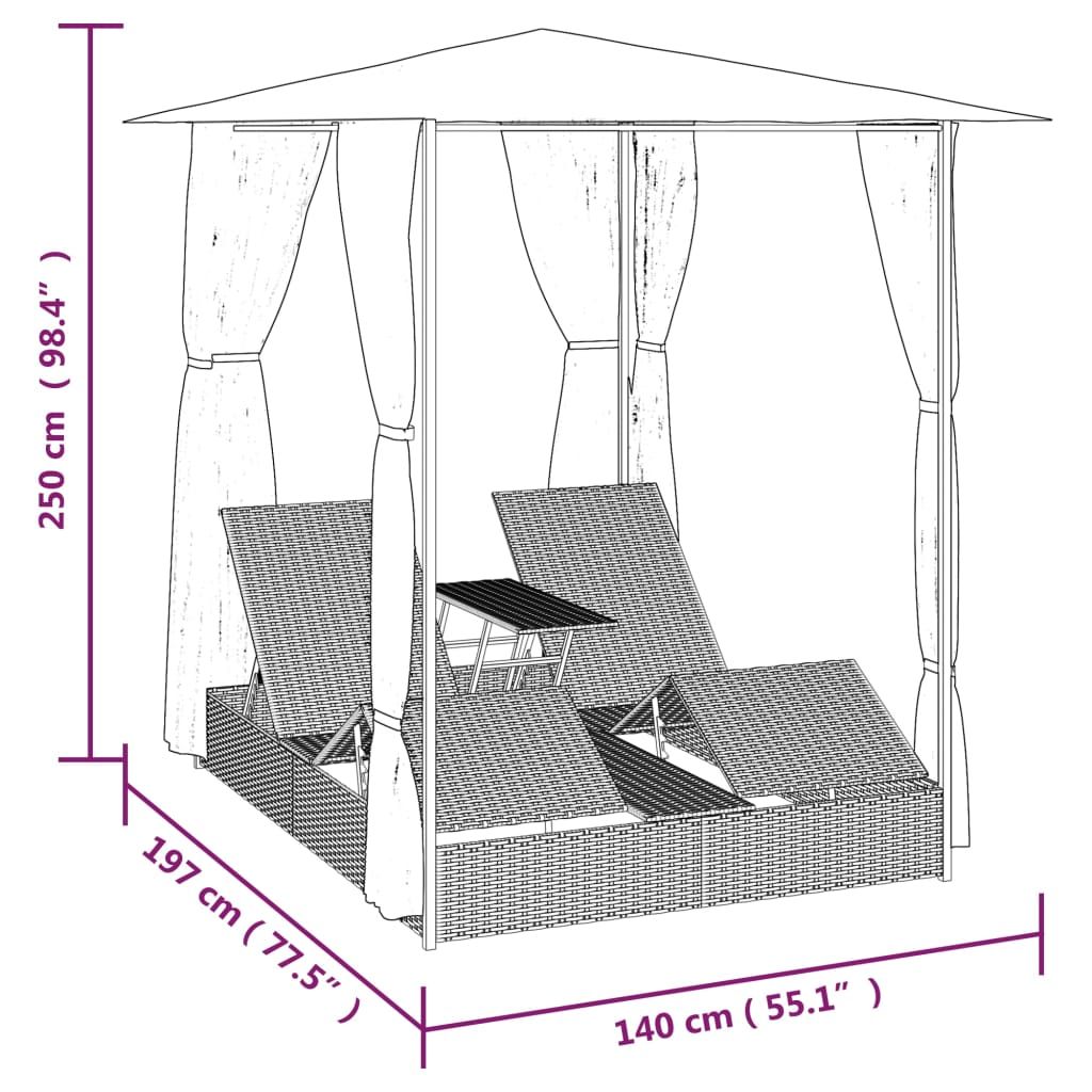 Podwójny leżak ogrodowy z zasłonami, polirattan, brązowy