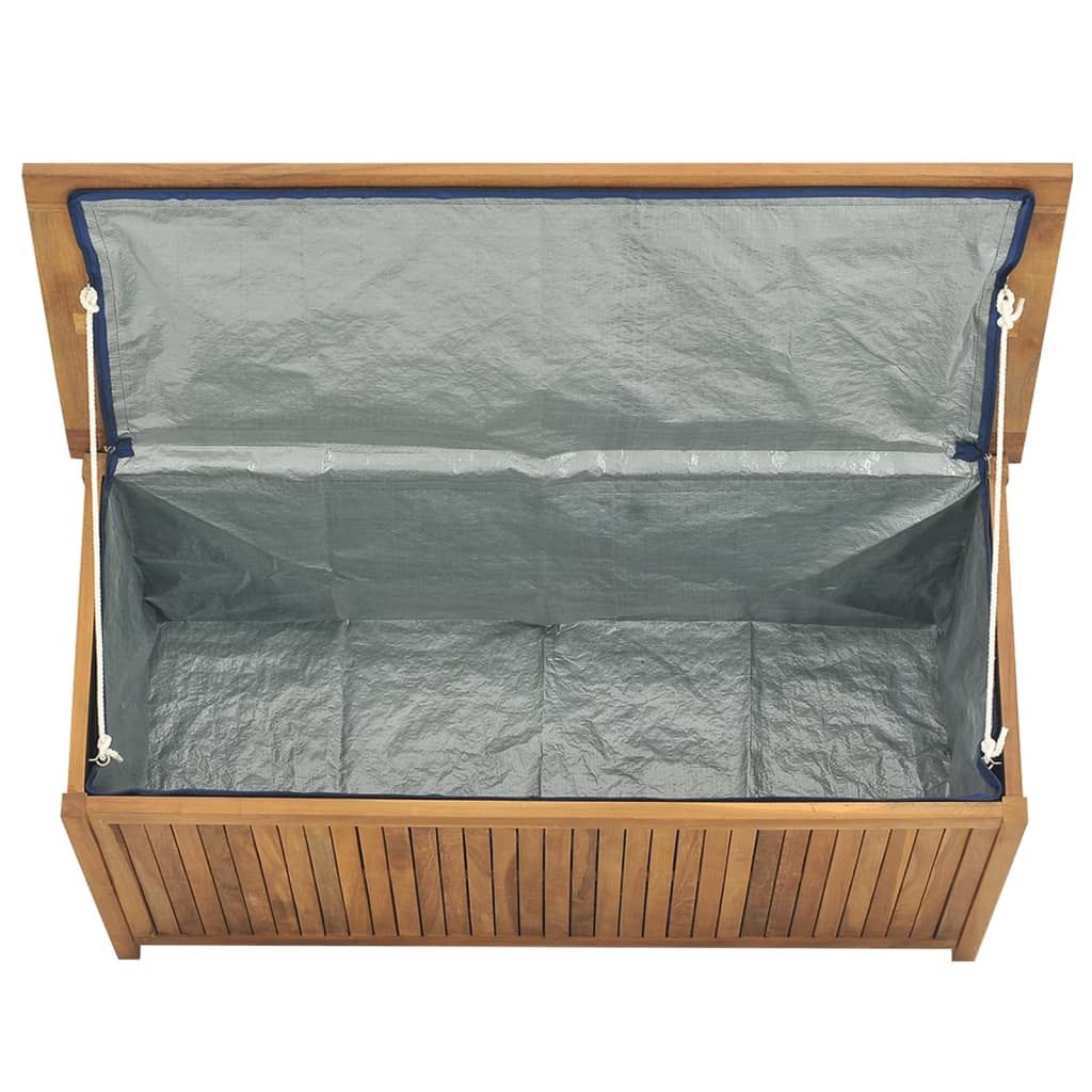 Opis produktu: Ta skrzynia ogrodowa z łatwo otwieraną pokrywą zapewni Ci mnóstwo miejsca do schowania swoich narzędzi i innych przyborów.Wysokiej jakości materiał: lite drewno tekowe to piękny, naturalny materiał. Było ono sezonowane, suszone komorowo, a następnie drobno oszlifowane, aby nadać mu bardzo gładką powierzchnię. Drewno tekowe jest bardzo mocne i odporne na czynniki pogodowe.Dużo miejsca: przestronna skrzynia ogrodowa może posłużyć do przechowywania i uporządkowania poduszek, zabawek dziecięcych, narzędzi ogrodowych i innych akcesoriów.Przydatne akcesoria: wewnątrz znajduje się torba z PE. Można schować w niej rzeczy, aby pozostały one suche.Zastosowanie: skrzynia ta jest idealna do ogrodu, szopy lub garażu.