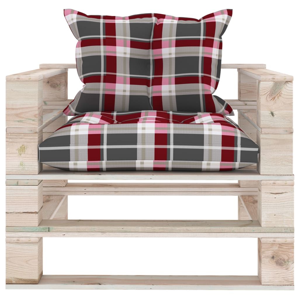 Sofa ogrodowa z palet, z poduszkami w czerwoną kratę, sosna