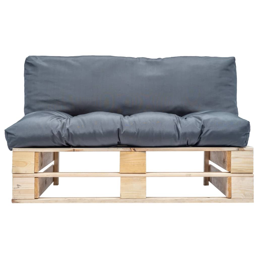 Sofa ogrodowa z palet z szarymi poduszkami, sosna
